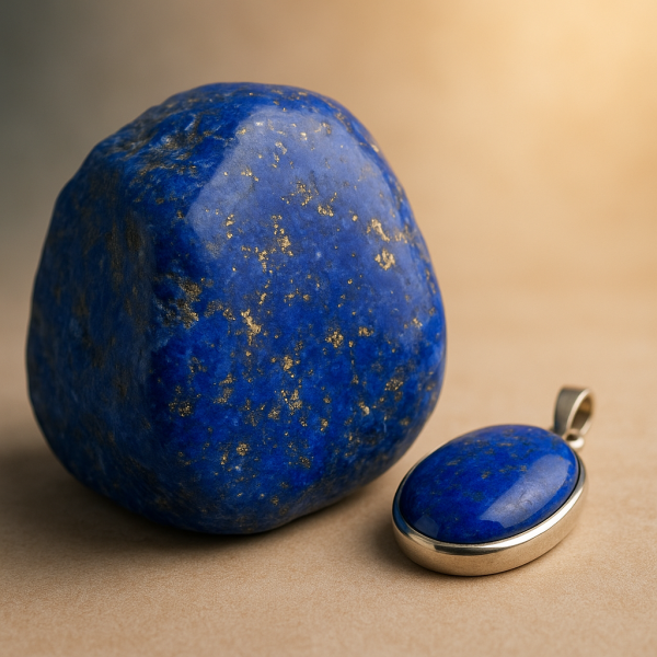 Le vrai lapis lazuli affiche une couleur vive et est souvent parsemé de paillettes dorées de pyrite, là où les imitations semblent trop uniformes.